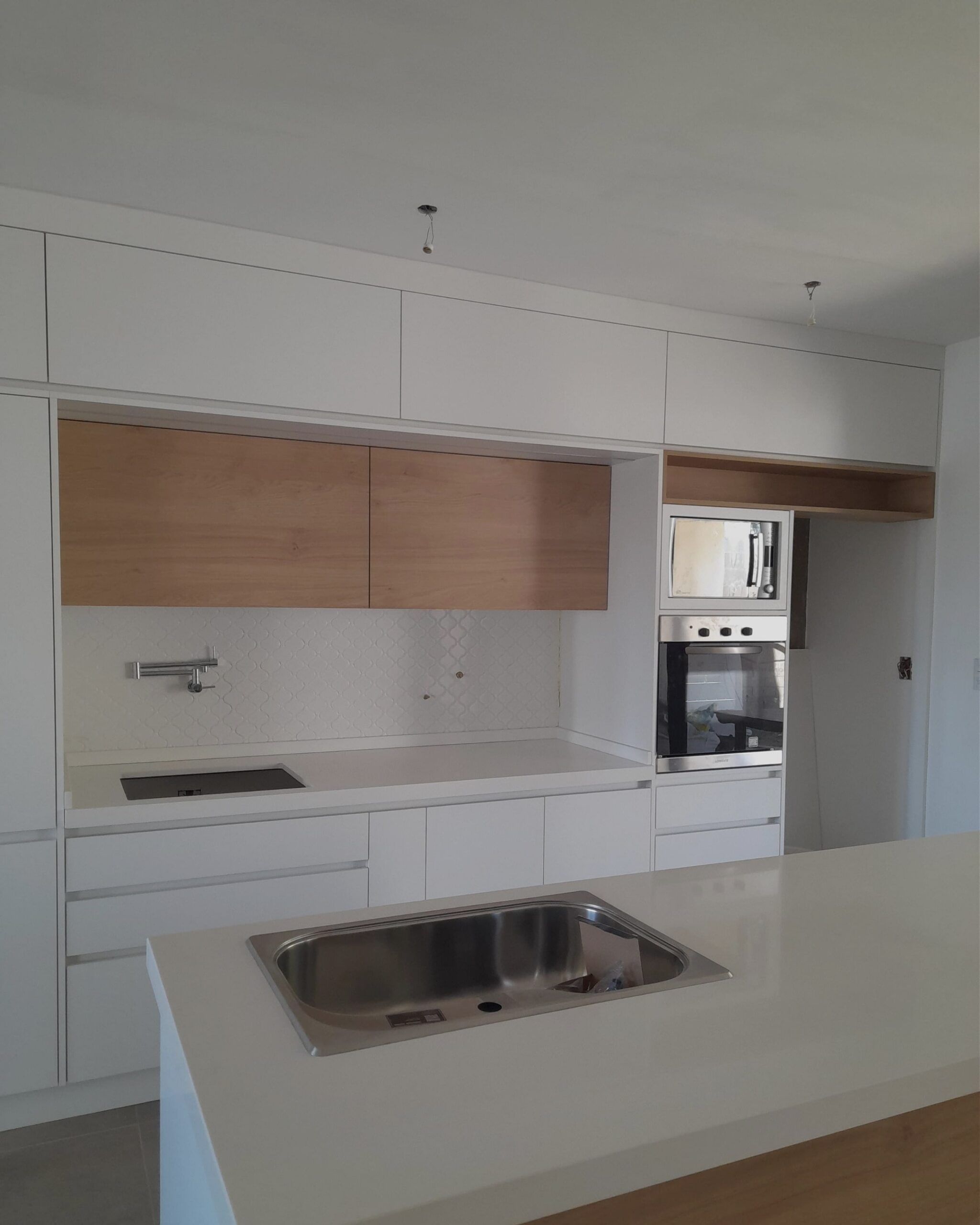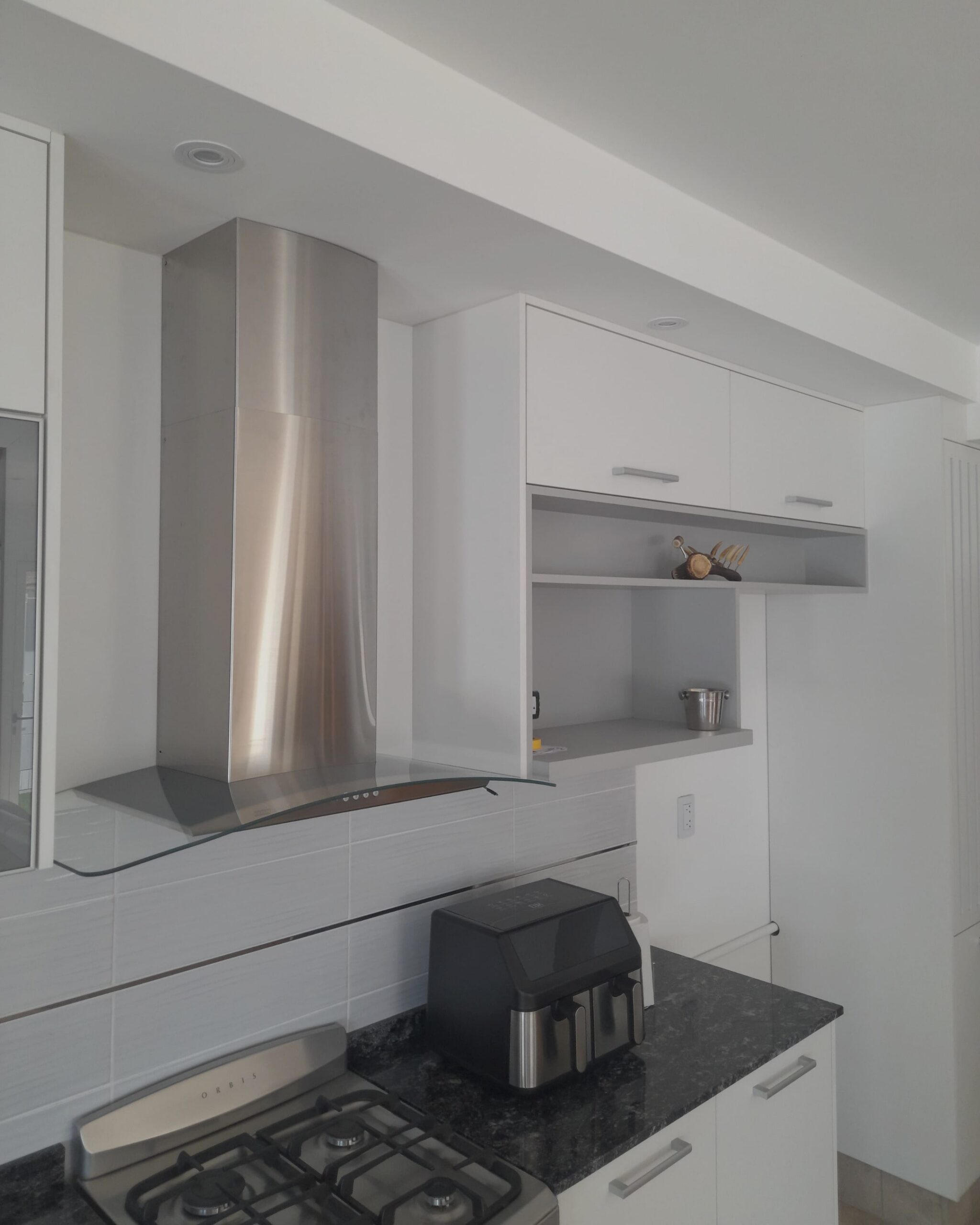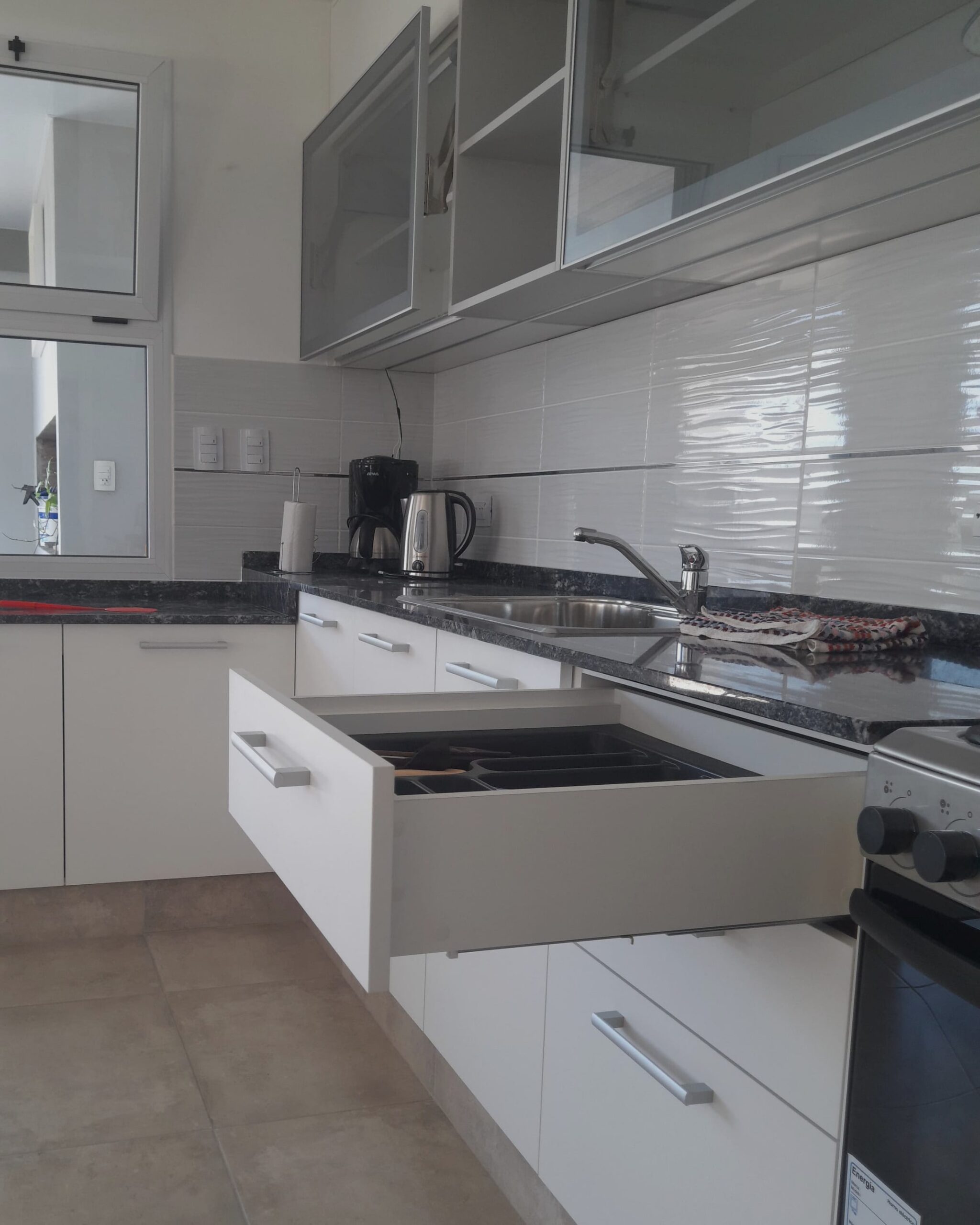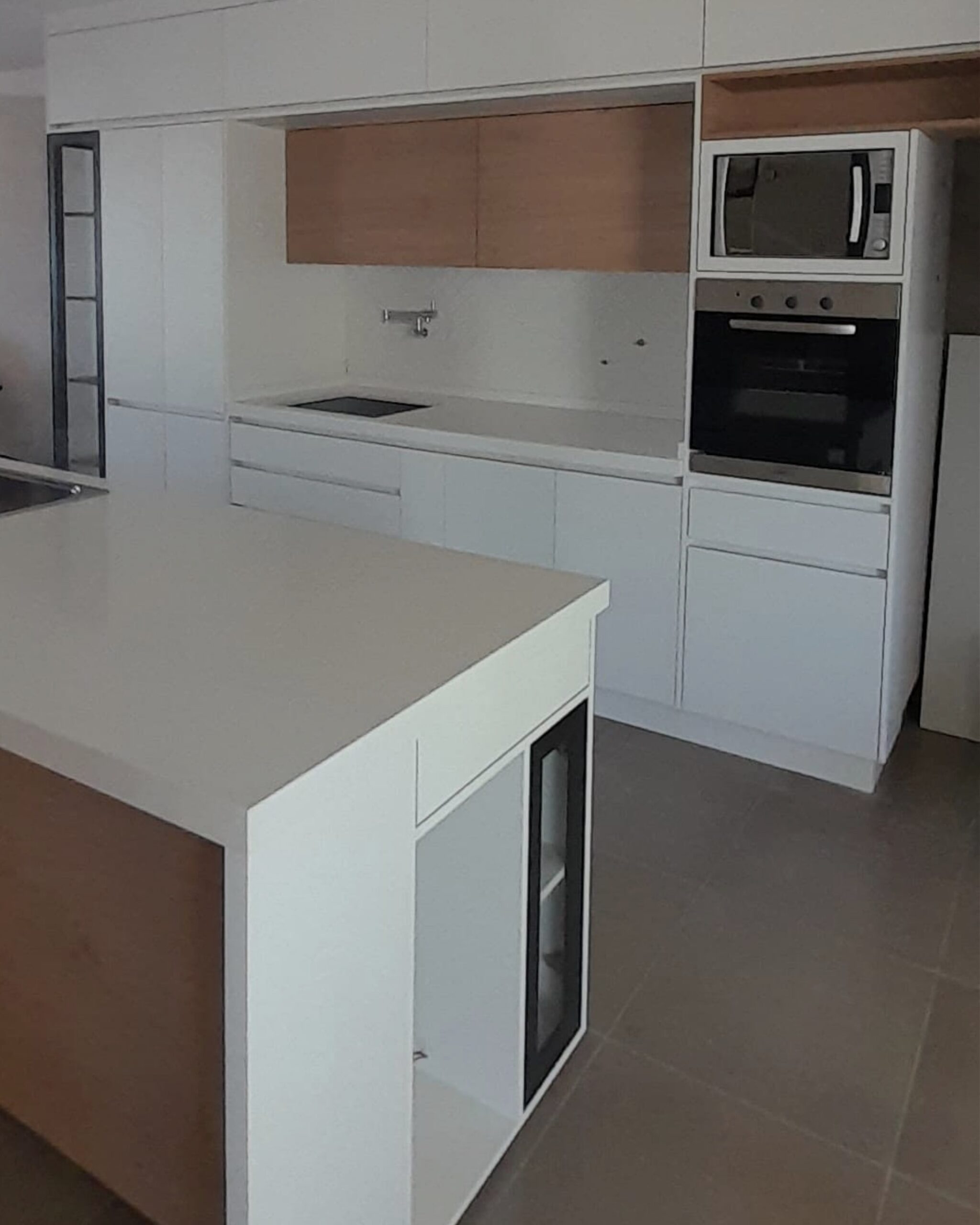 Para este proyecto desarrollamos una cocina de estilo abierto, con amoblamientos a medida que combinan funcionalidad, estética y materiales de calidad. Todo el mobiliario fue fabricado en melamina sobre MDF laqueado a pintura blanca, con frentes sin herrajes y sistema de gola en melamina, logrando una línea visual limpia y moderna.