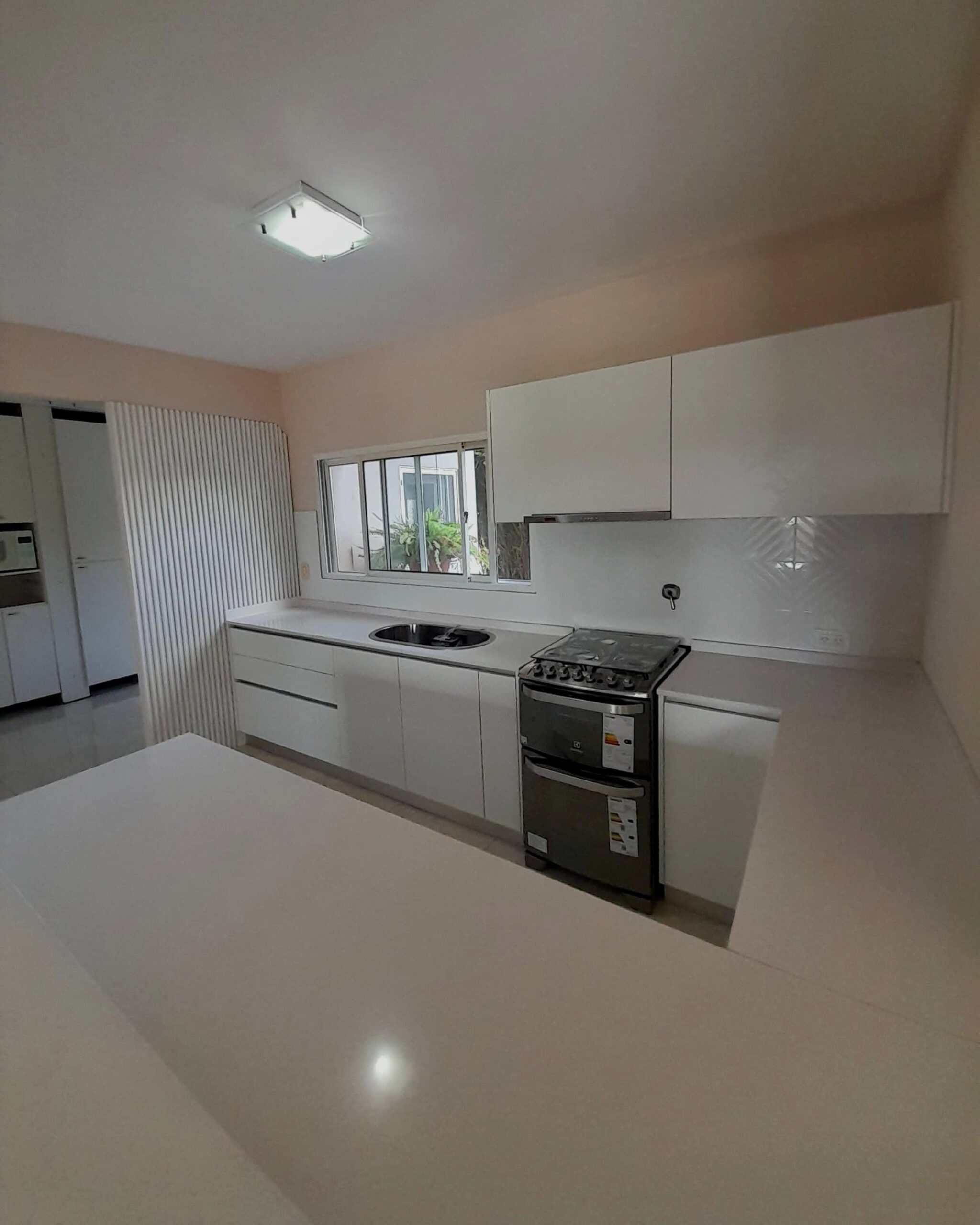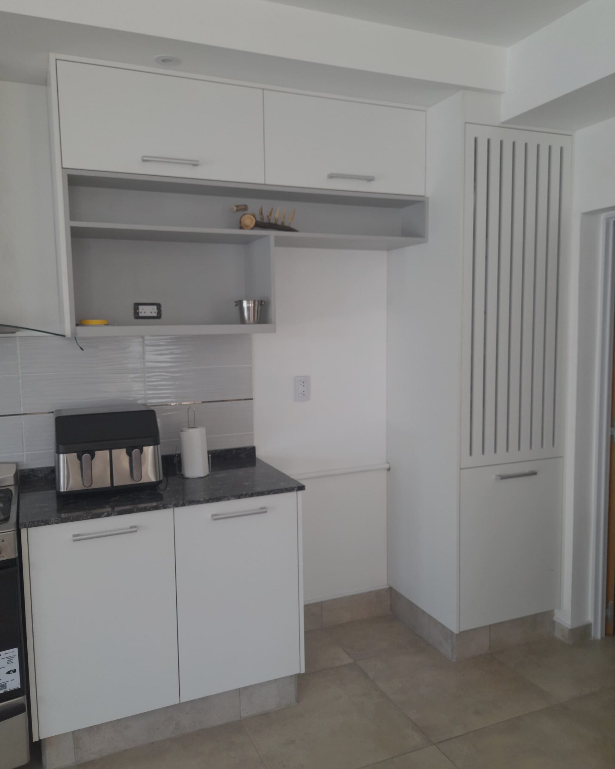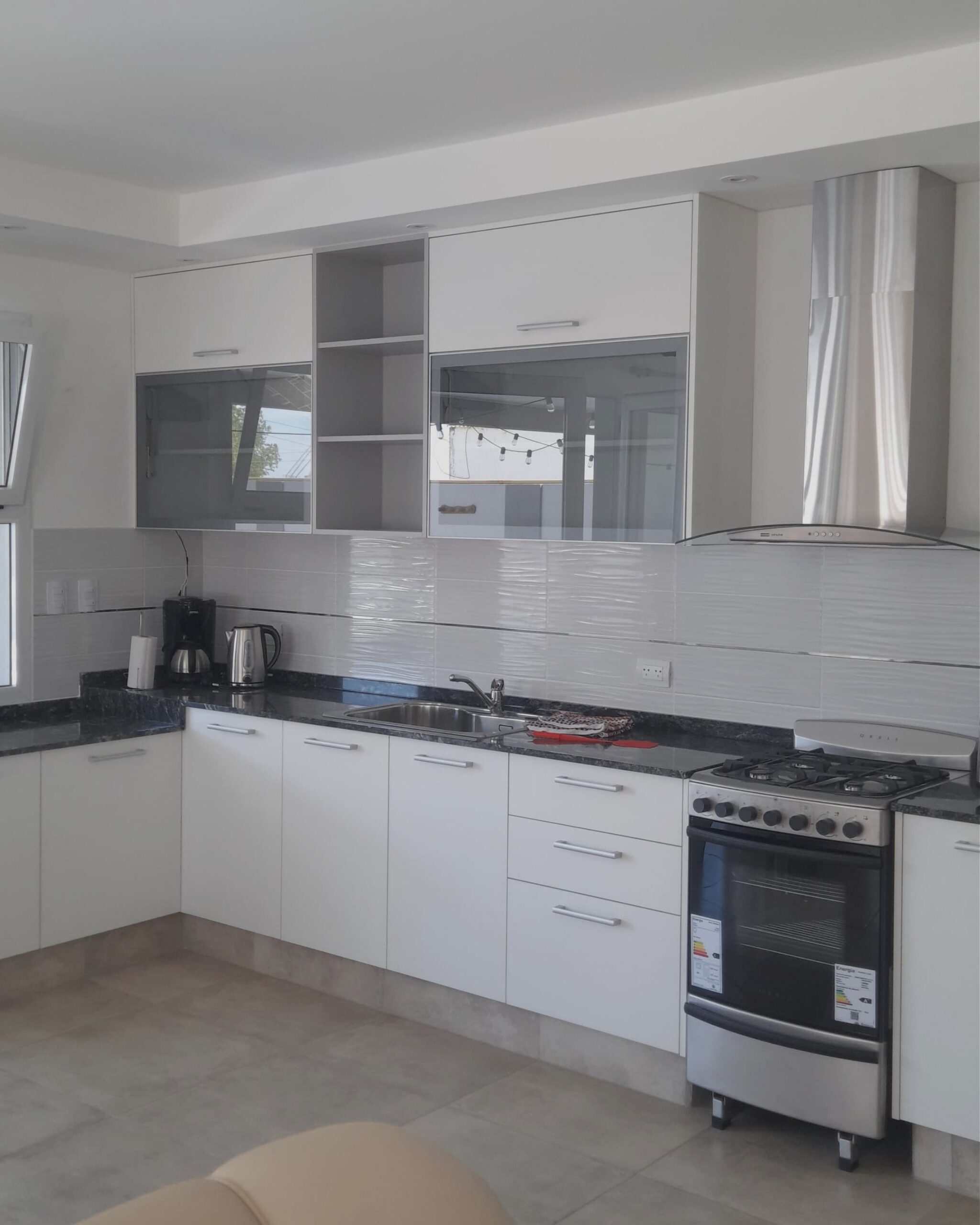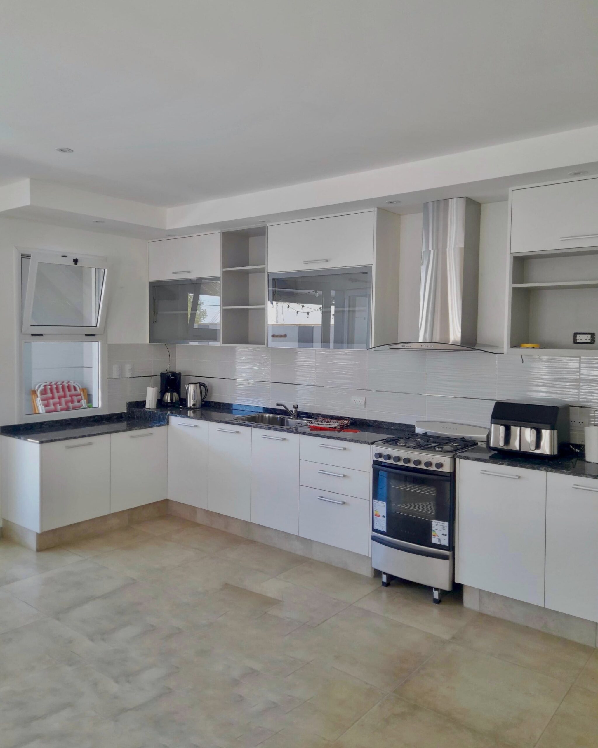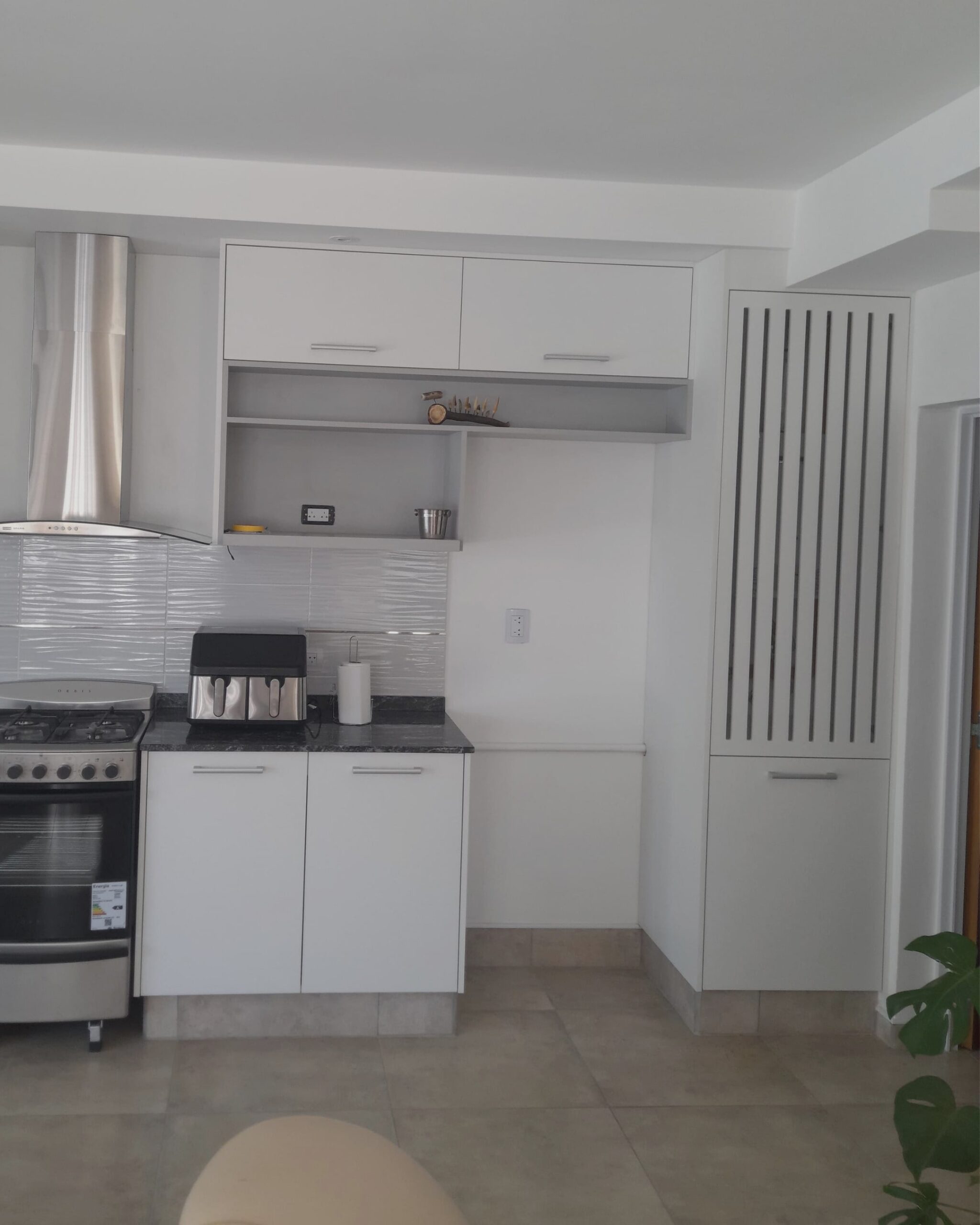 Para este proyecto desarrollamos una cocina de estilo abierto, con amoblamientos a medida que combinan funcionalidad, estética y materiales de calidad. Todo el mobiliario fue fabricado en melamina sobre MDF laqueado a pintura blanca, con frentes sin herrajes y sistema de gola en melamina, logrando una línea visual limpia y moderna.
