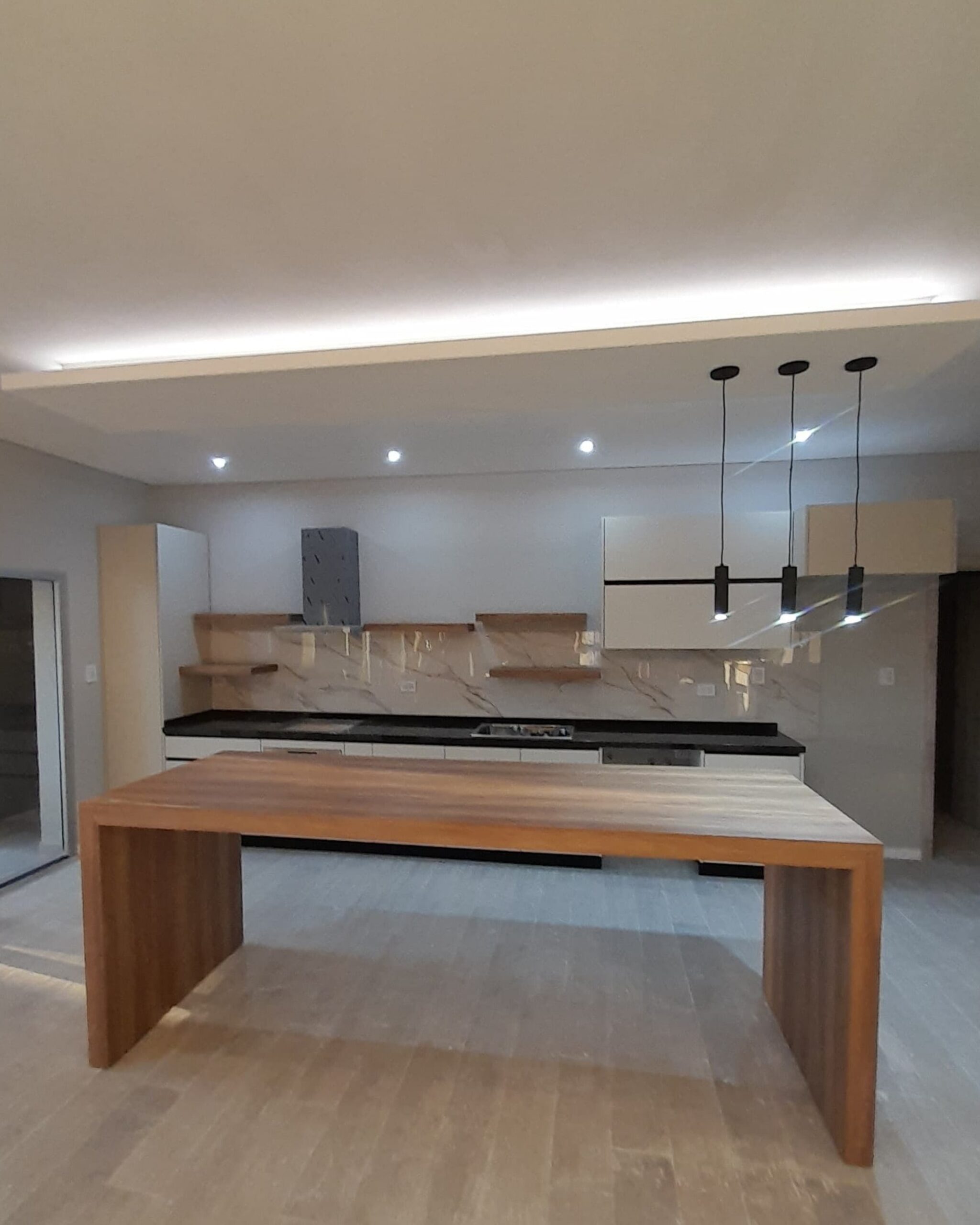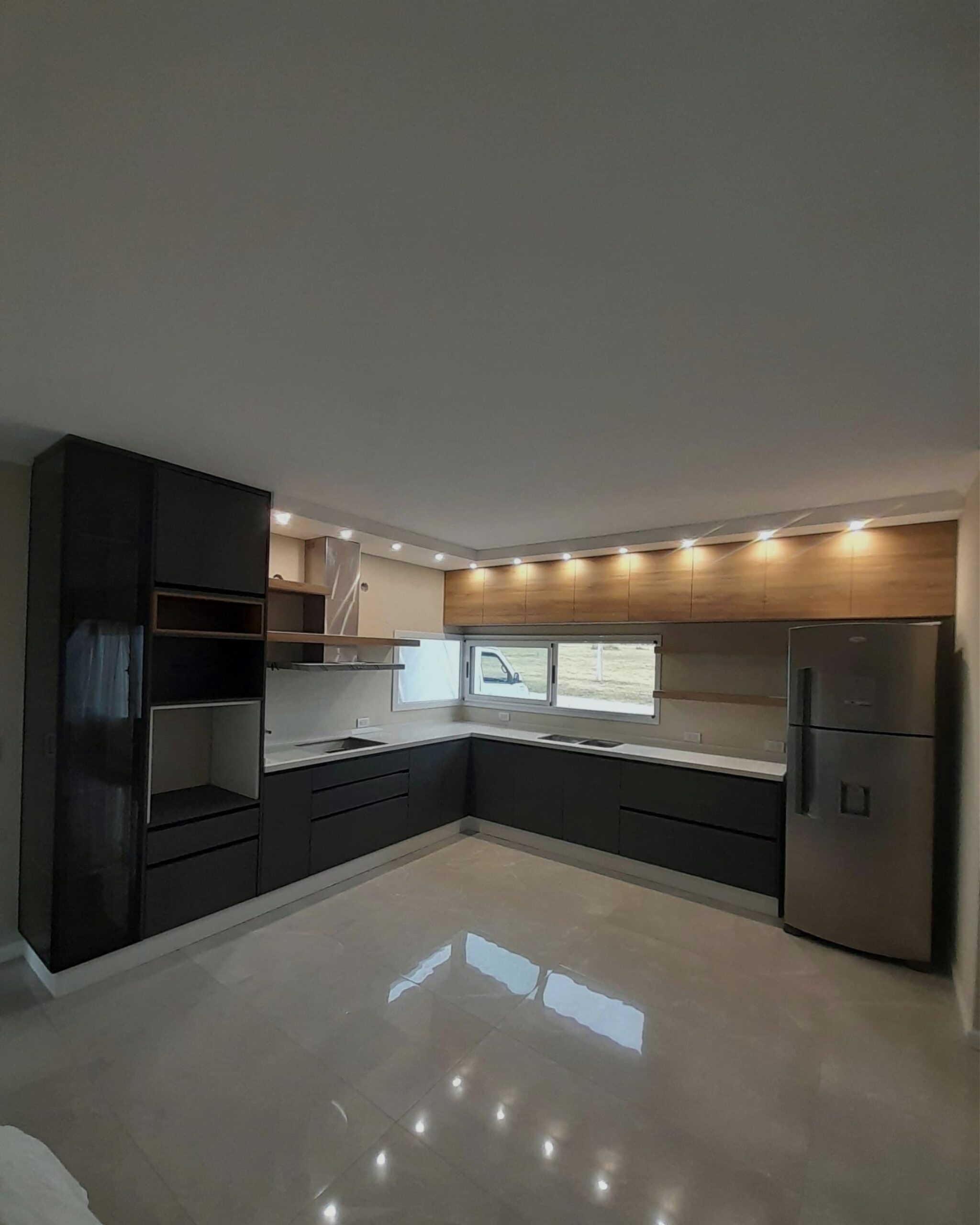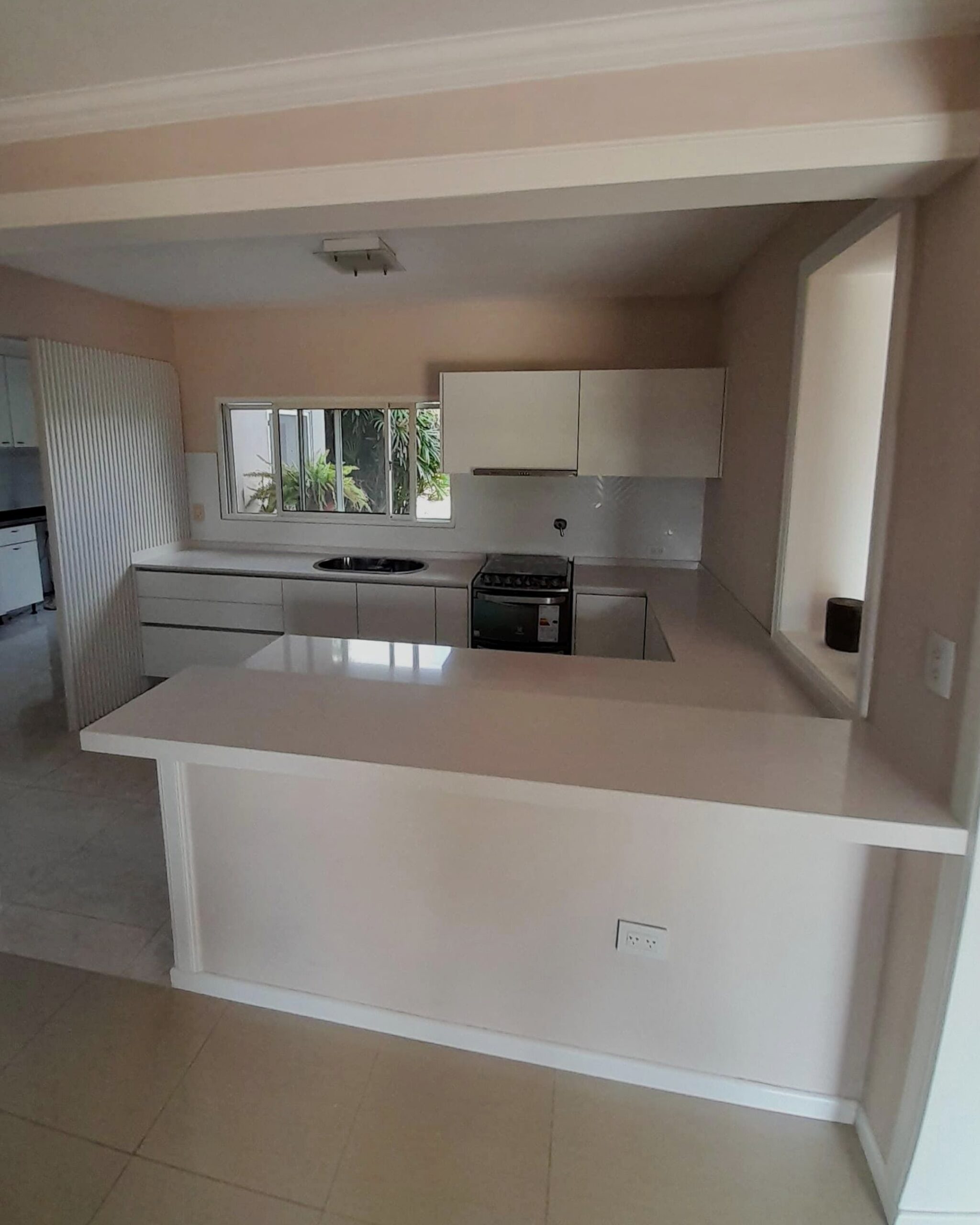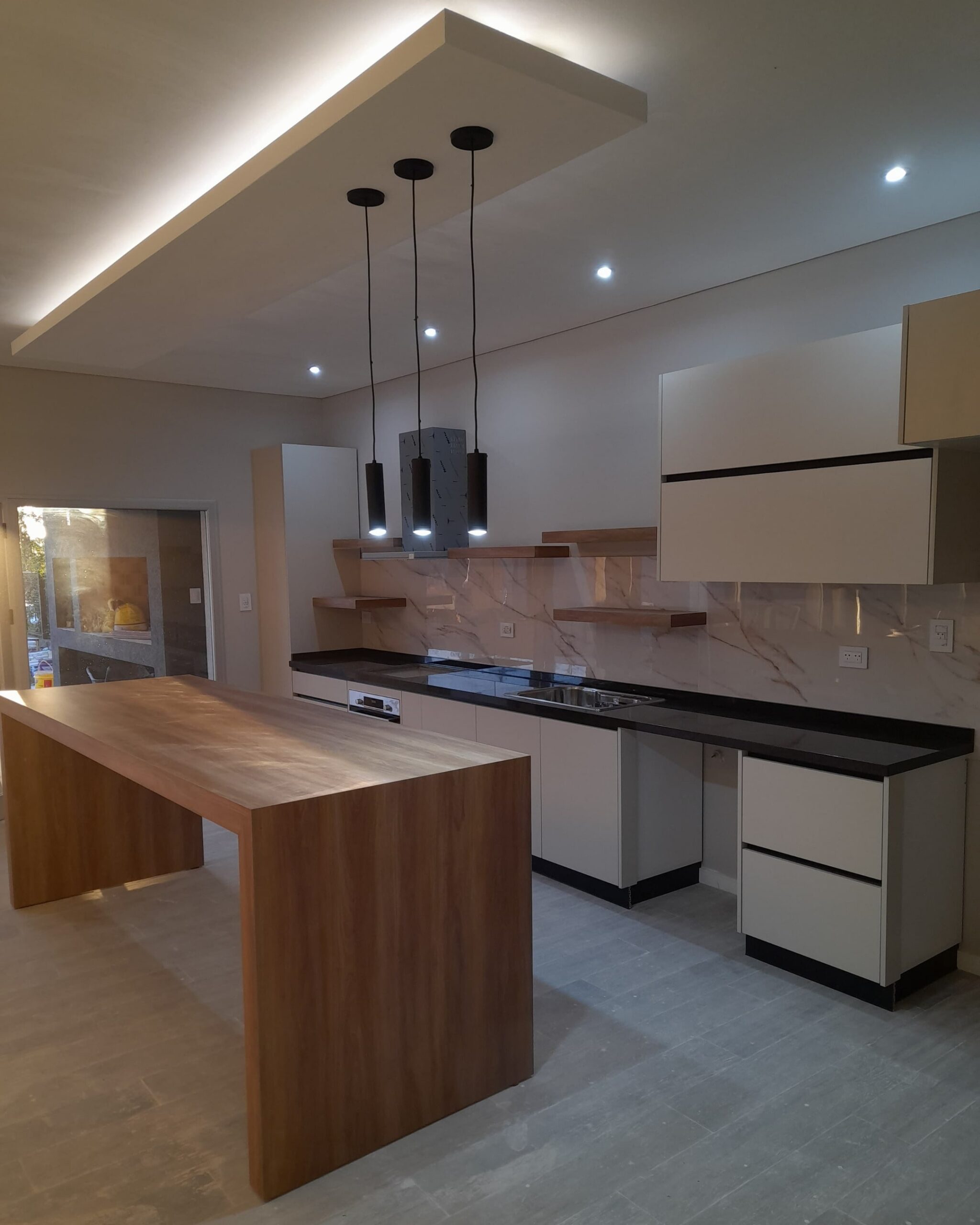 Para este proyecto desarrollamos una cocina de estilo abierto, con amoblamientos a medida que combinan funcionalidad, estética y materiales de calidad. Todo el mobiliario fue fabricado en melamina sobre MDF laqueado a pintura blanca, con frentes sin herrajes y sistema de gola en melamina, logrando una línea visual limpia y moderna.