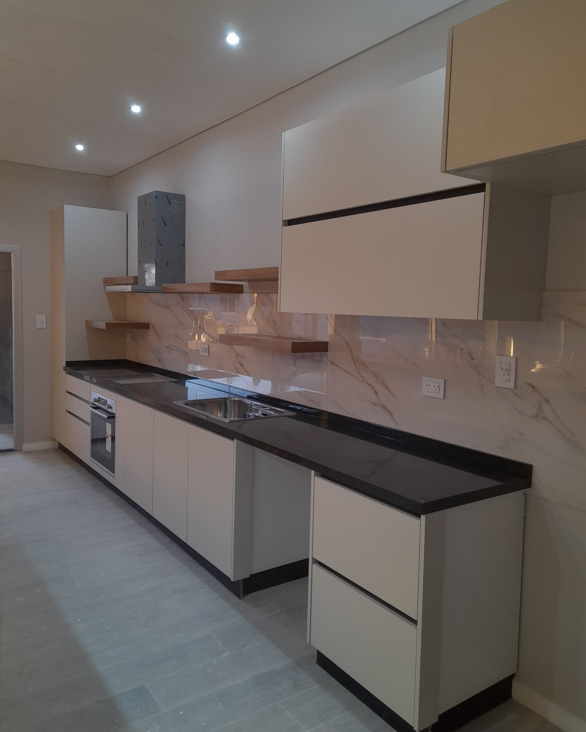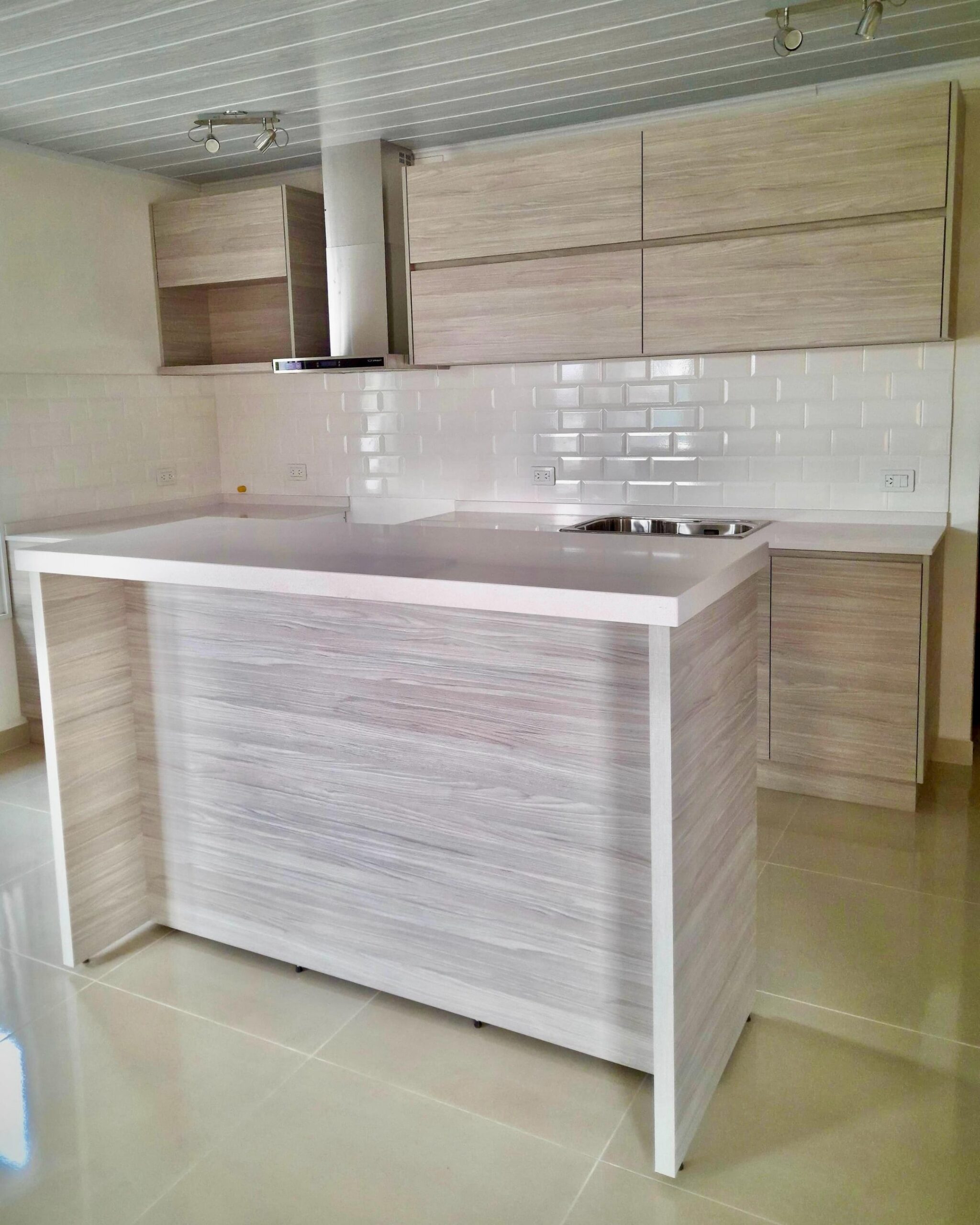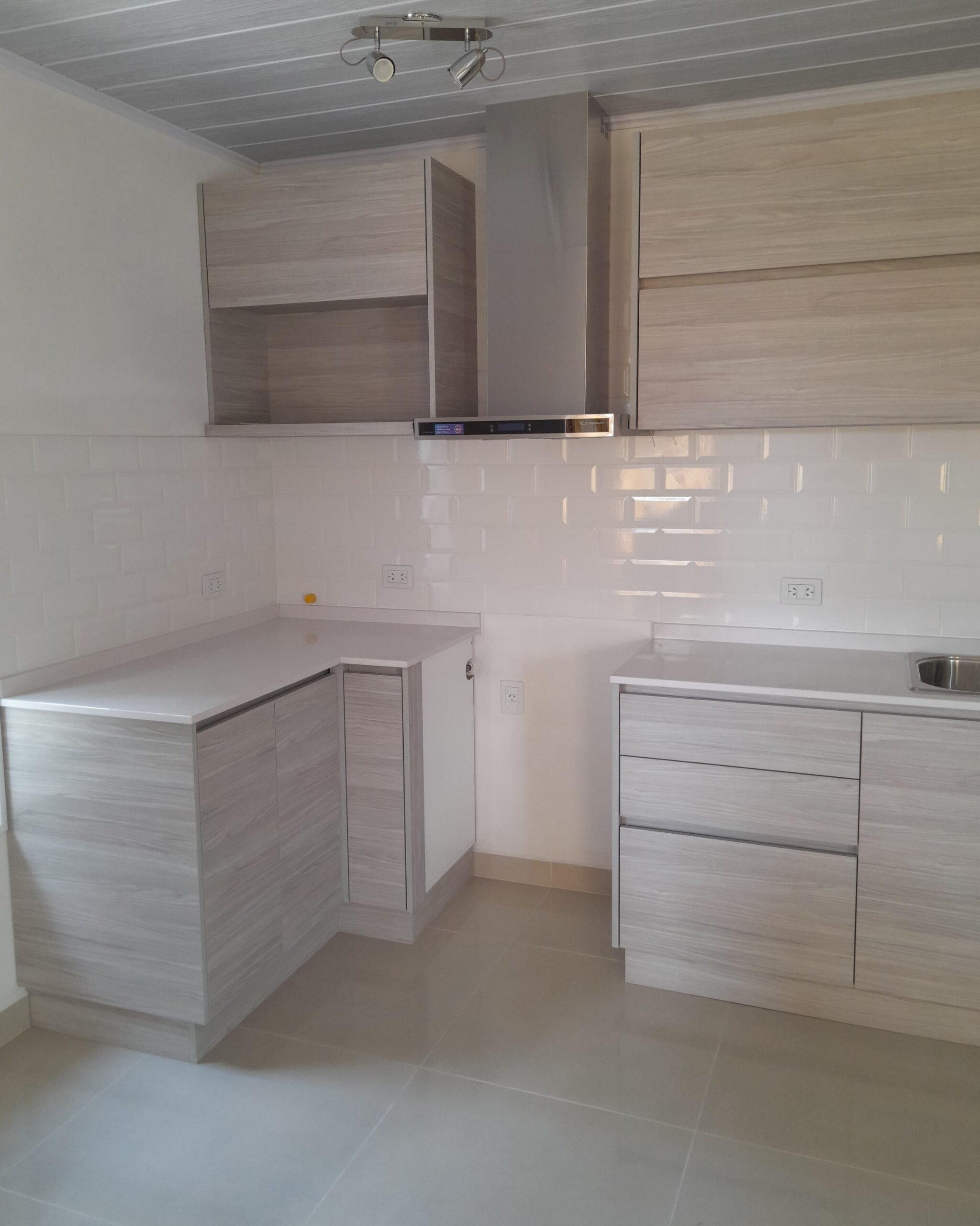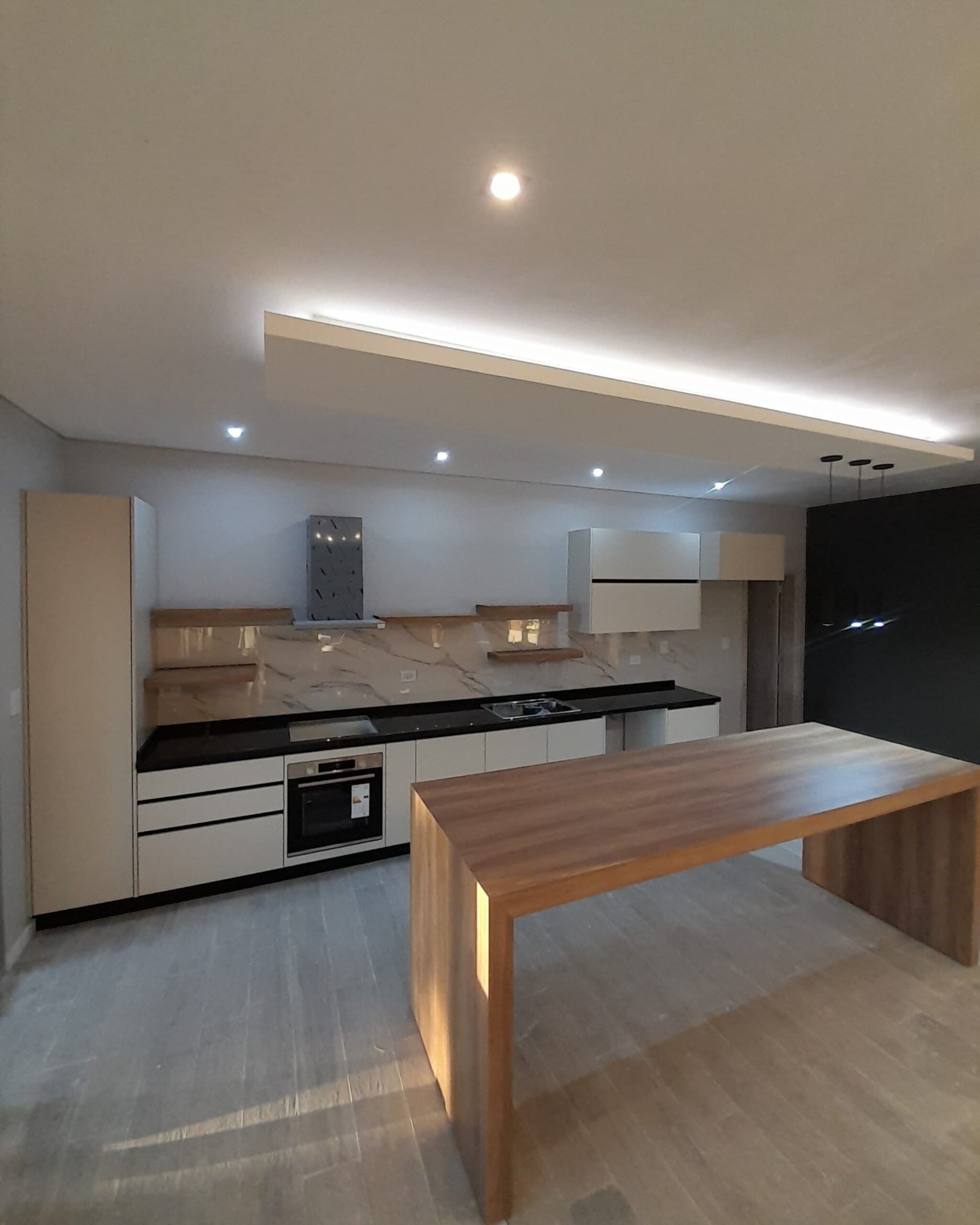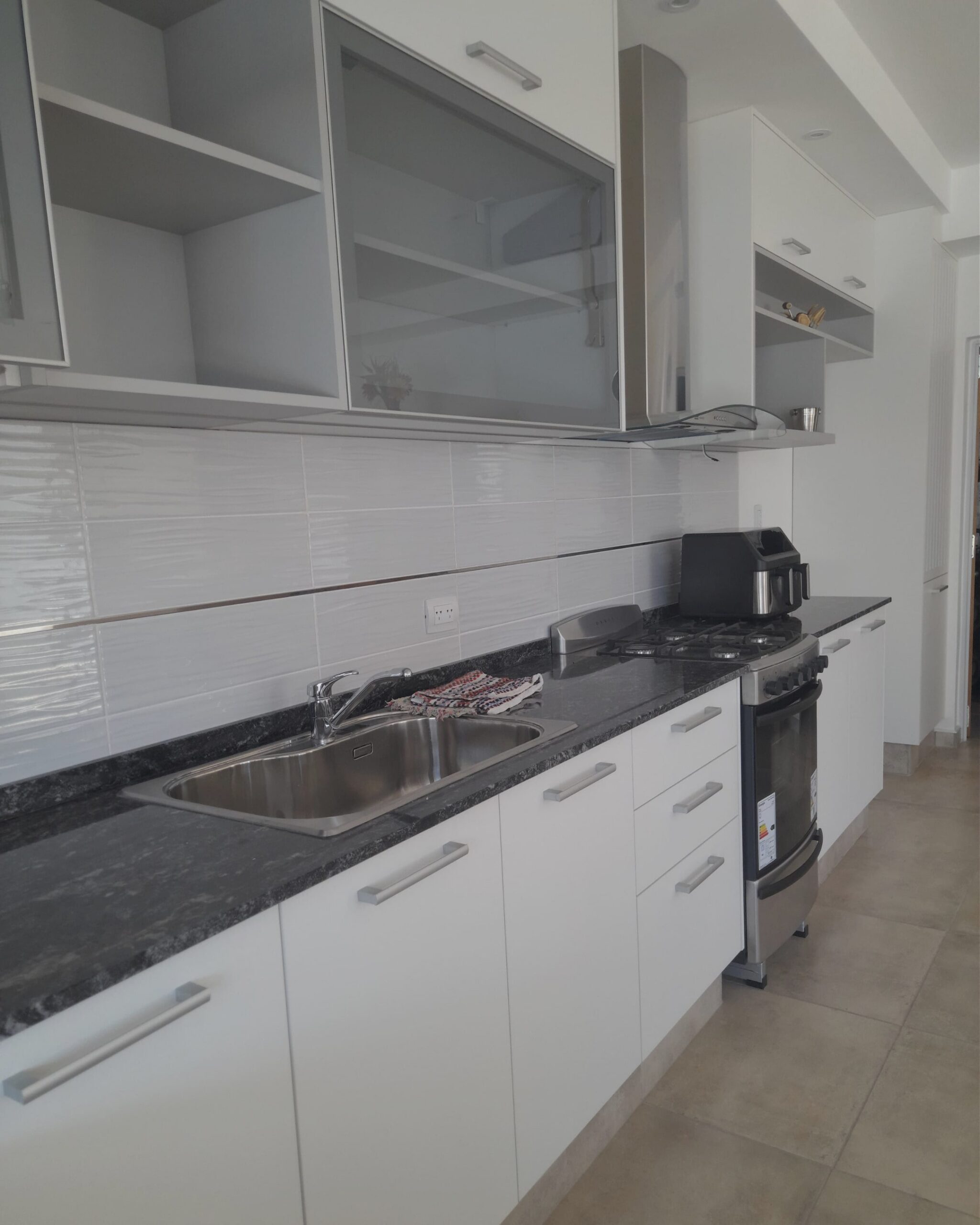 Para este proyecto desarrollamos una cocina de estilo abierto, con amoblamientos a medida que combinan funcionalidad, estética y materiales de calidad. Todo el mobiliario fue fabricado en melamina sobre MDF laqueado a pintura blanca, con frentes sin herrajes y sistema de gola en melamina, logrando una línea visual limpia y moderna.