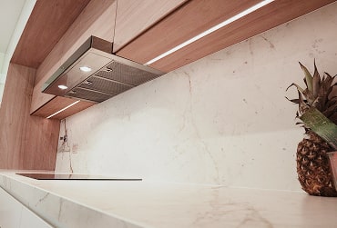 La isla central cumple un rol protagónico, equipada con cajonera, lavavajillas y bacha, y bajo mesada con puertas batientes. Su superficie fue realizada en Neolith Abu Dhabi Silk, una piedra de última generación con fondo blanco roto y vetas doradas y grisáceas que aportan textura y distinción. Este acabado, con efecto erosionado en coincidencia con el dibujo de las vetas, ofrece una estética natural y sofisticada.