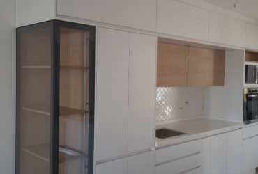 La alacena baja en tono Scotch incorpora un perfil de iluminación LED embutido, que mejora la funcionalidad del espacio de trabajo. En la parte superior, una alacena blanca con puertas abatibles amplias optimiza el almacenamiento. El equipamiento incluye también una torre para horno y microondas empotrados, y una torre despensera, integrados en el diseño general.
