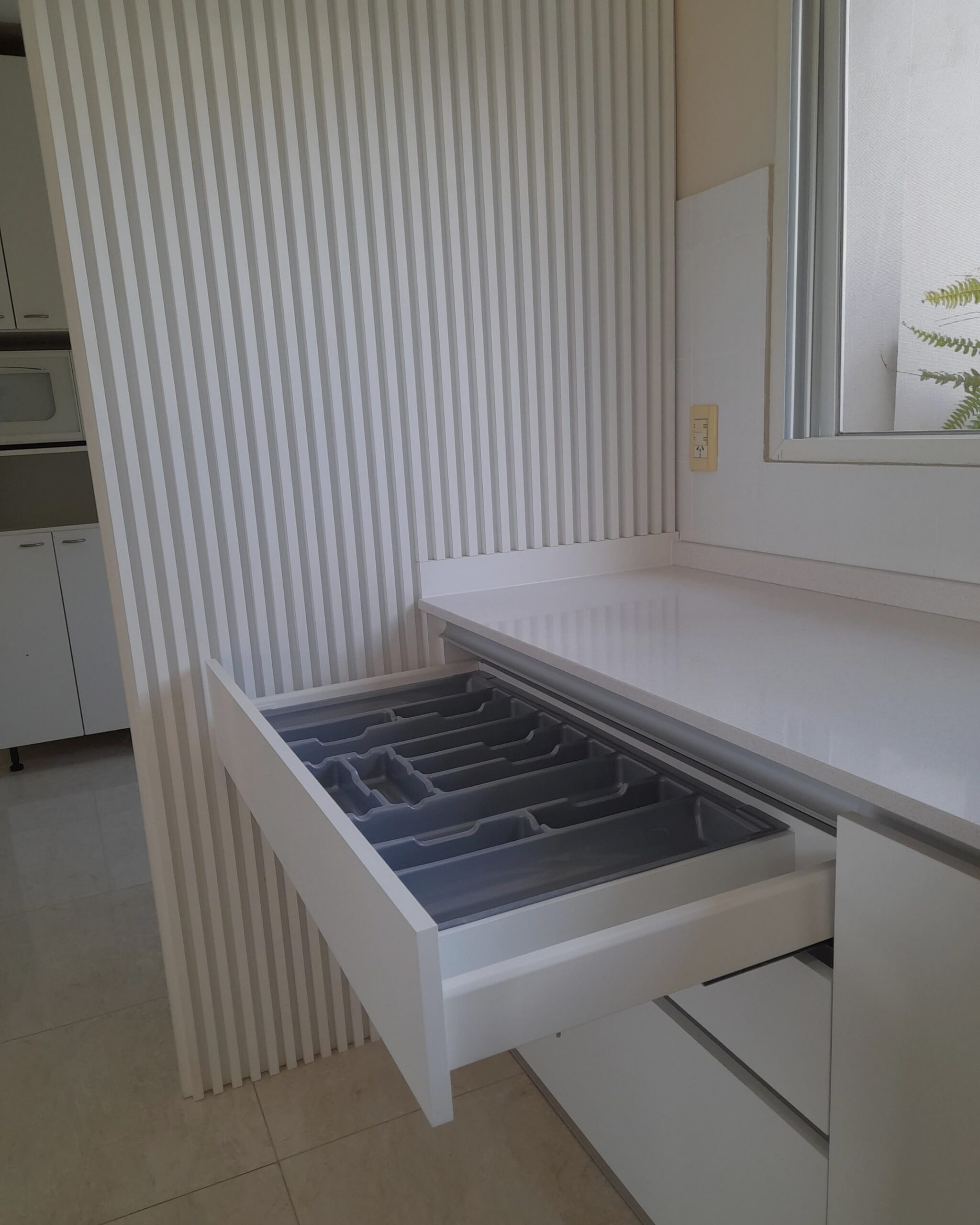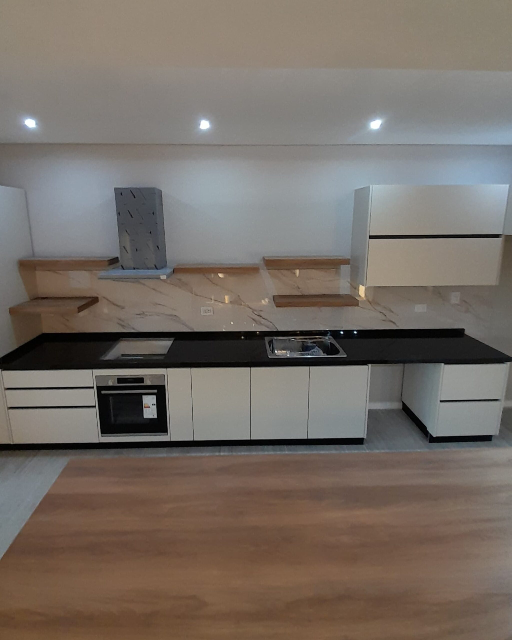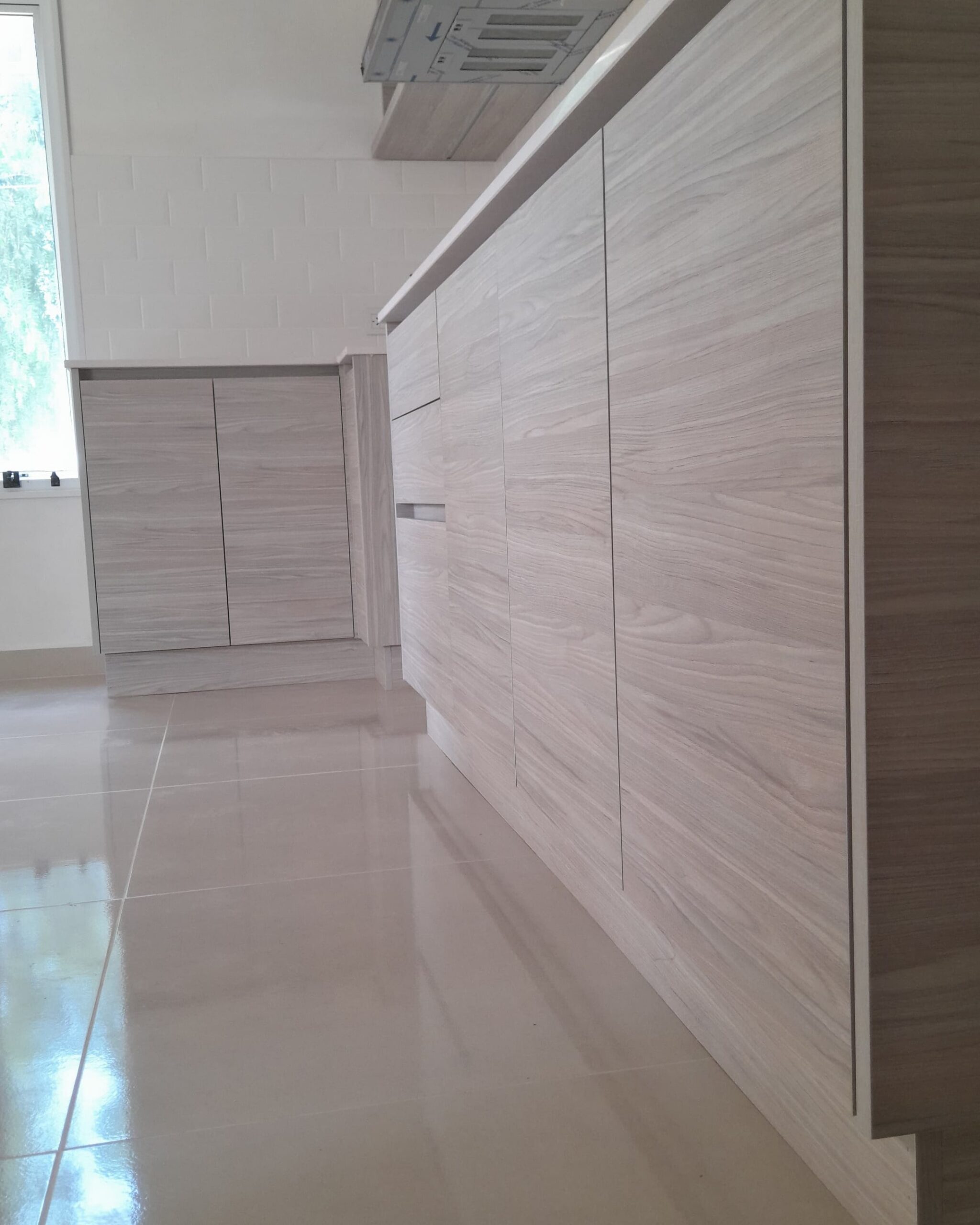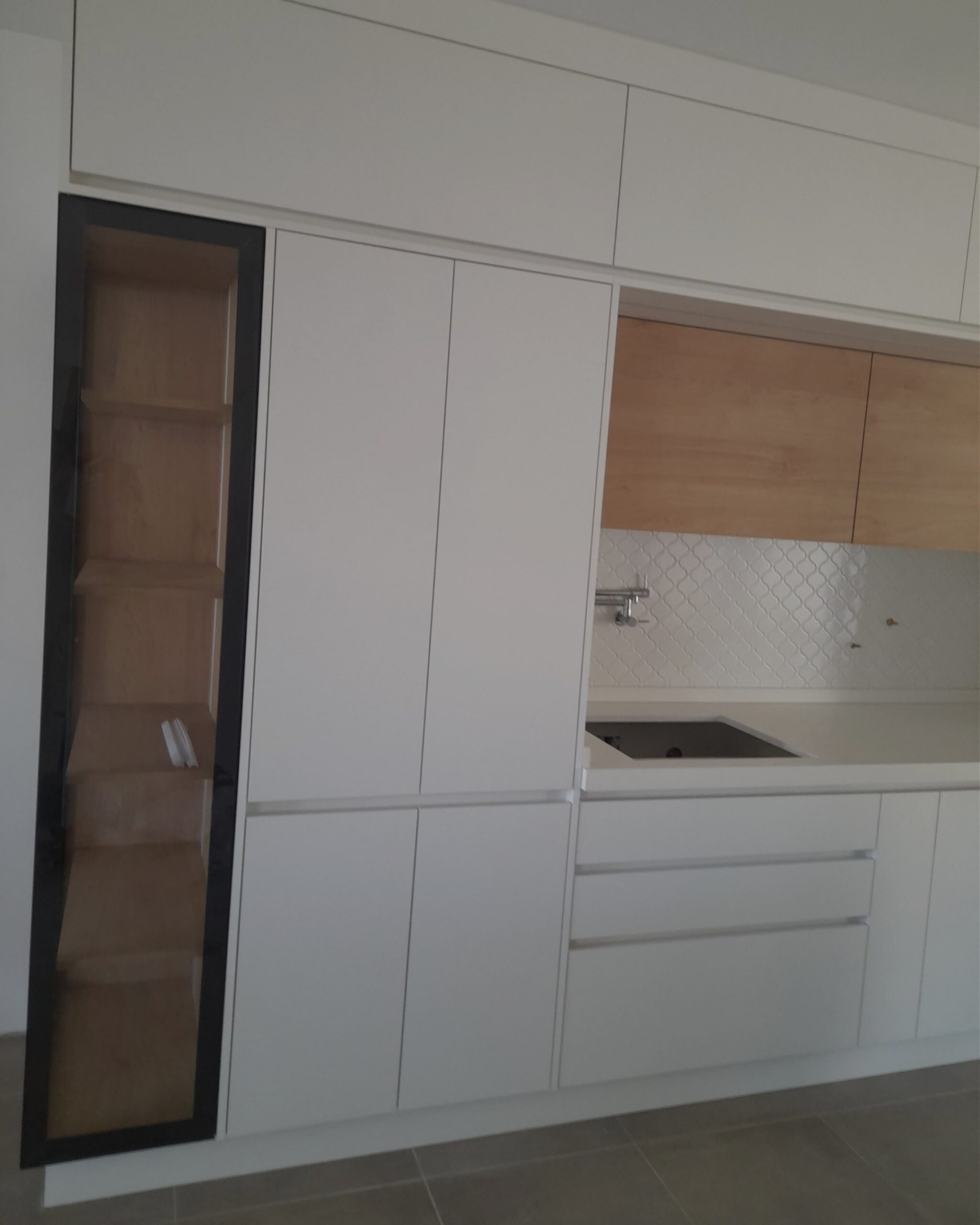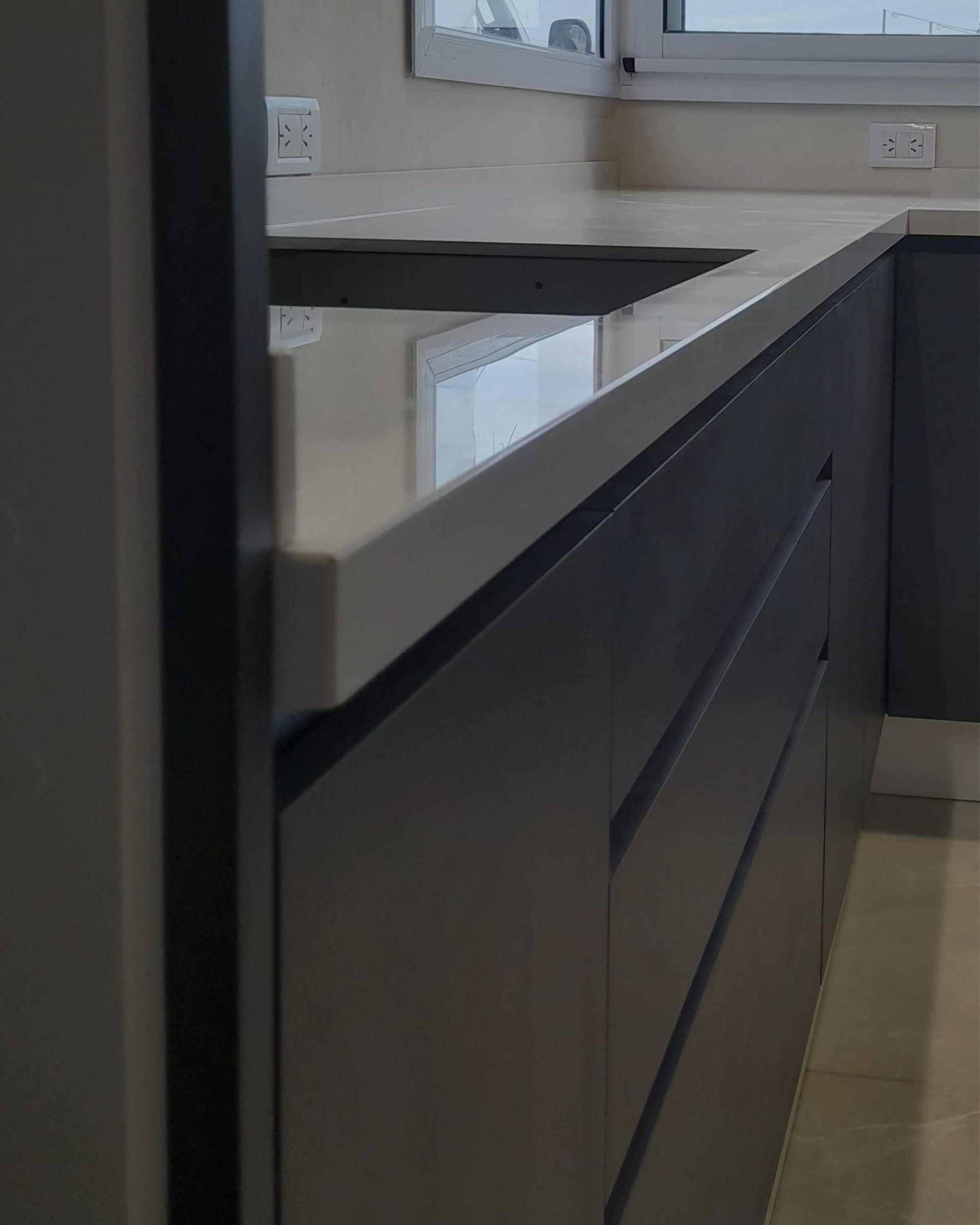 -Sistema gola en melamina para frentes sin herrajes, logrando una estética minimalista.